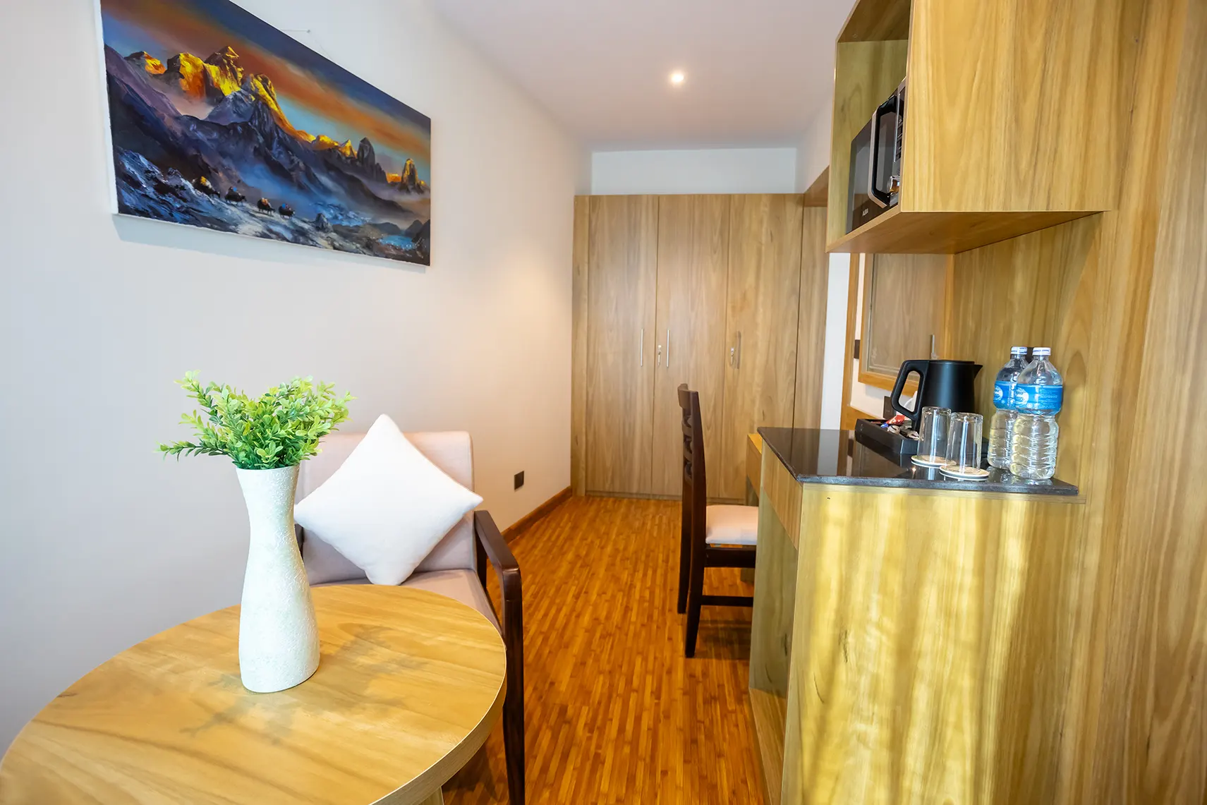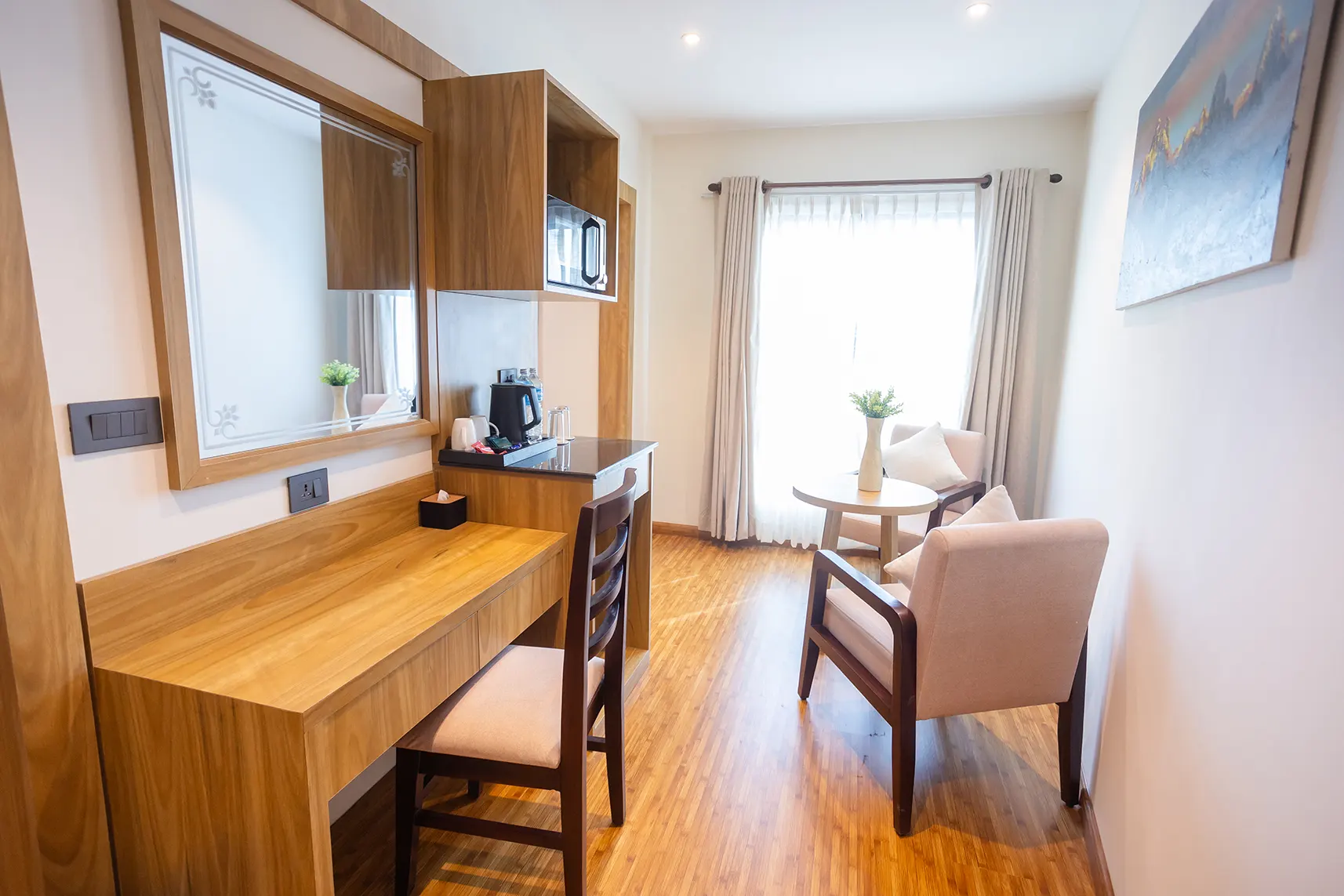 Our premium suite offers generous space with a separate dining area and attached bathroom, perfect for extended